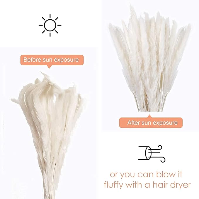 - Warm Tips - Our Pampas grass are naturally dry plants,a little shedding is normal. Pampas grass may be compressed after long journey to you,and you can expose them to the sun for 1-2 hours and shake them once or twice to make them fluffy before use, and then you can use this beautiful natural dried pampas grass as a decoration or gift.