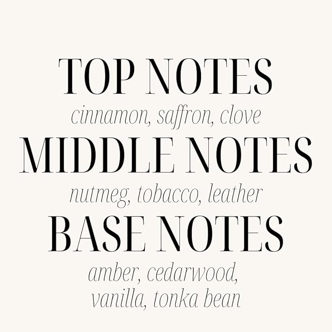 - Fragrance Notes: Top Notes - cinnamon, saffron and clove; Middle notes - nutmeg, tobacco and leather; Base notes - amber, cedarwood, vanilla and Tonka bean.