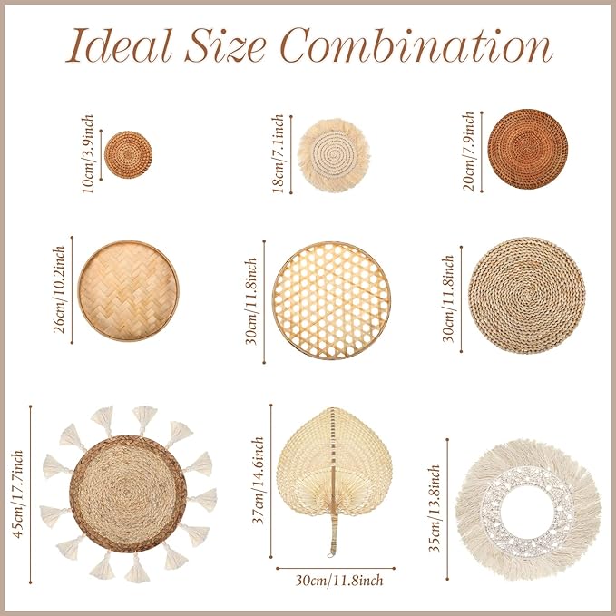 - Basket Decor Sets: you will get 9 styles of delicate woven wall basket decors in different sizes, you can enjoy an authentic boho with these decors; These baskets bring stylish style to any room, combine them together, sufficient quantities can meet your decorative needs to fit different places or rooms for you to create a unique home decor combination