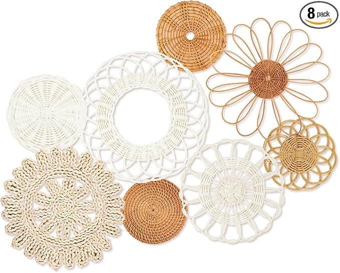 Boho Wall Basket Decor Set of 8,Rattan Flower Wall Decor,Flat Woven Baskets Wall Hanging Decor,Unique Boho Wicker Seagrass Wall Decor(Rattan Classic)