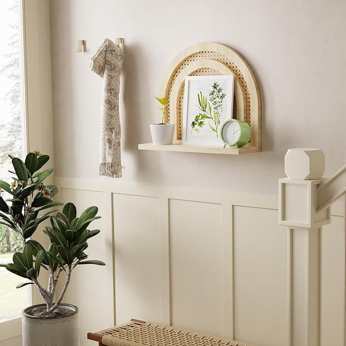 - GREAT DECORATIVE SPACE: The arched wall shelf has a smooth arch design and a rattan background board. Three wooden arches are arranged to enrich the rattan background design. Its special shape adds a natural and unique beauty to your home.