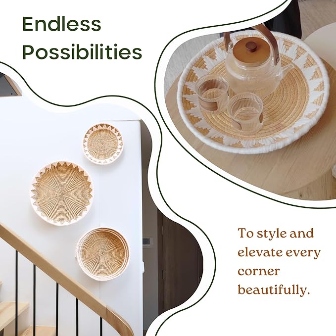 - πππππππππ ππππππππππ πππππππππππππ: This 3-piece wall basket decor set includes sizes 22", 19", and 15", allowing endless arrangement options of your own idea. Their rounded form creates a dimensional 3D effect that transforms blank walls into stylish focal points with a boho-chic vibe to any room.