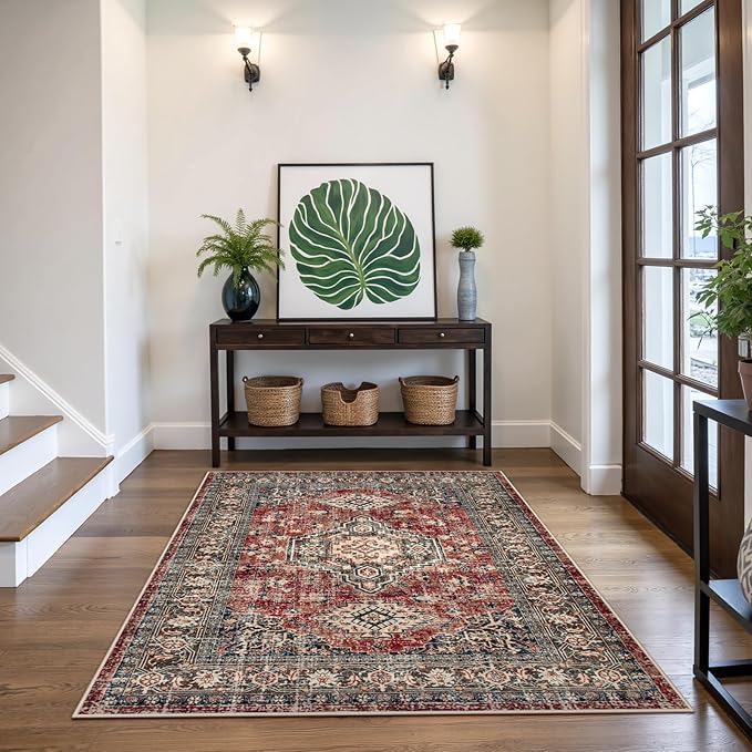 Lahome Oriental Washable Rugs for Bedroom, 4X6 Soft Living Room Rug Ultra-Thin Non-Slip Stain Resistant Vintage Low-Pile Throw Carpet for Office Entryway, Brick Red