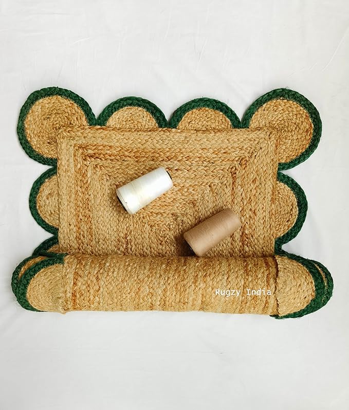 RugzyIndia Scalloped Pattern Natural Jute Area Rug Bohemian Entryway Doormat Rug Farmhouse Scallop Rug Natural Base Green Border Runner Rugs (Green, 2'x3')