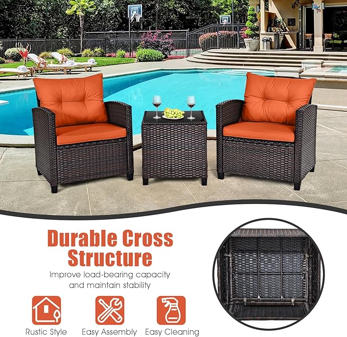HAPPYGRILL 3 Pieces Patio Conversation Set, Outdoor Furniture Set PE Rattan Sofa Set with Removable Cushions, PE Wicker Chairs with Tempered Glass Side Table for Porch Lawn Garden Balcony Backyard