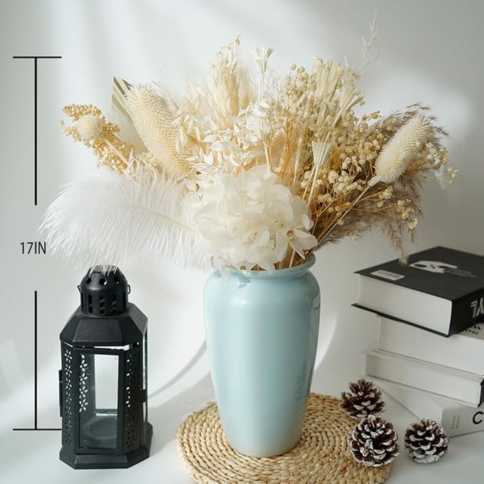 - Elegant natural dried bouquet: This dried bouquet includes hydrangeas, lemongrass, North Sea oats, Billy balls, dried palm leaves Etc, 14 different natural plants, and 1pcs ostrich feathers.The total length of the bouquet is about 17 inches.The vase shown is not included in the package,