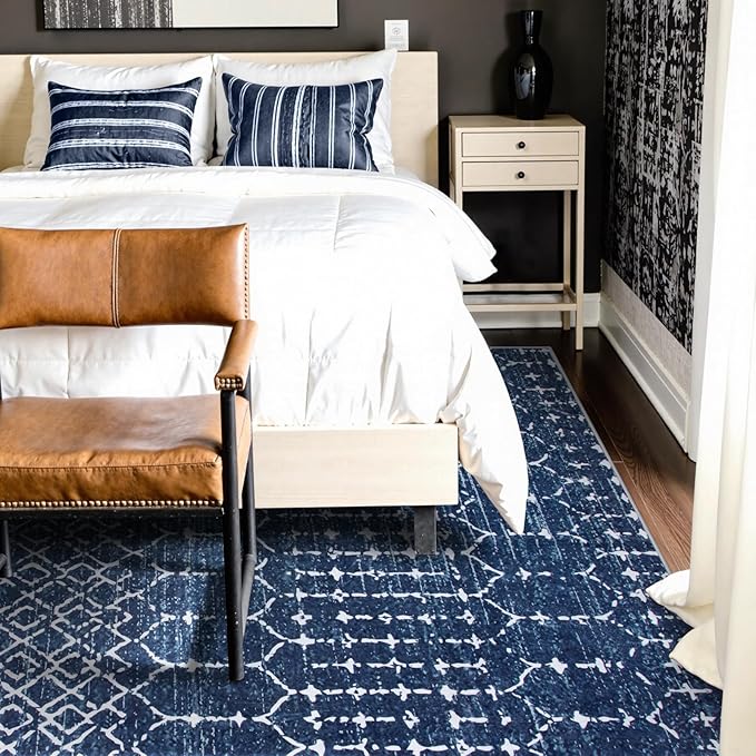Lahome Moroccan Living Room Rug 9x12 Non-Slip Washable Ultra-Thin Soft Large Area Rug, Modern Geometric Print Stain Resistant Carpet for Bedroom Dining Room, Blue