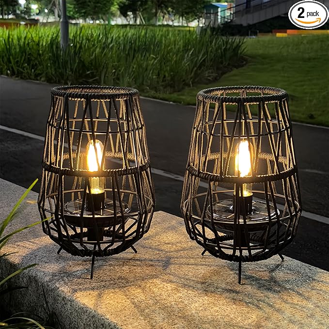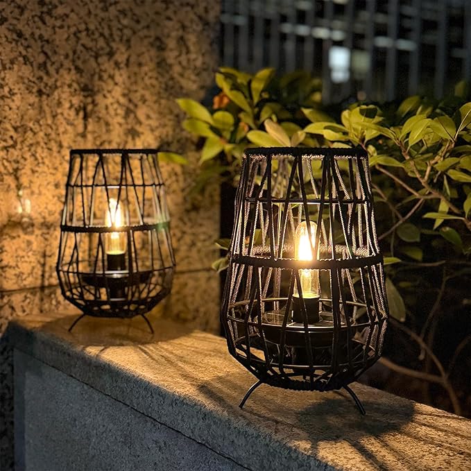 TRIROCKS Set of 2 Solar Lantern Outdoor Table Lamp Outside Hanging Solar Lights with Olifen Rope Waterproof Rattan Outside Deck Light for Patio Garden Lawn Yard (Black)