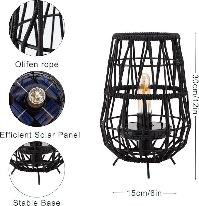 - PORTABLE LED OUTDOOR LANTERN: The cordless outdoor solar lantern is crafted from durable metal, PS materials, and a black olefin rope. Its compact, lightweight design ensures easy portability, while the sturdy jute rope handle allows for convenient hanging. Dimensions: 8" (L) × 8" (W) × 12" (H). The top solar panel is detachable, enabling independent charging under direct sunlight.