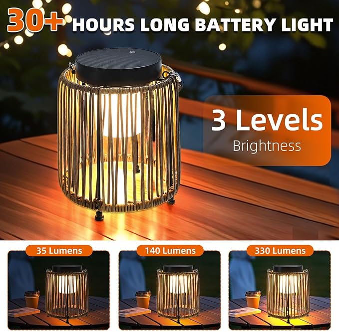 - [Premium Rattan Wicker Solar Outdoor Table Lamps] Crafted with rattan wicker strips using traditional weaving techniques. The gentle glow of 3000k warm white light diffused through the opalescent lampshade, imbues your surroundings with an enchanting ambiance. Suitable for indoor or outside use, warm white light will be an elegance decoration for you. Perfect for outside grill family camp, ideal for reading, drinking, eating, night walking, etc