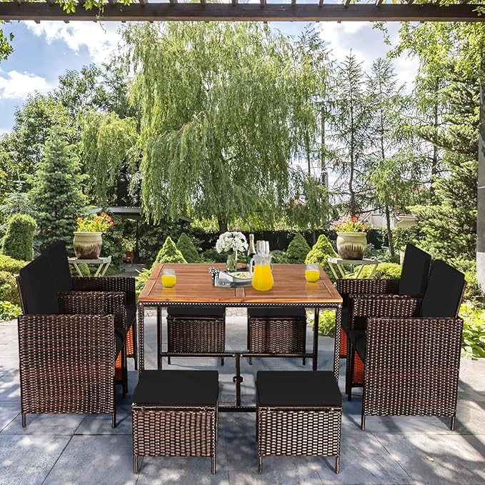 Tangkula 9 Pieces Acacia Wood Patio Dining Set, Space Saving Wicker Chairs and Wood Table with Umbrella Hole Outdoor Furniture Set, Suitable for Garden, Yard, Poolside, Outdoor Seating Set (Black)