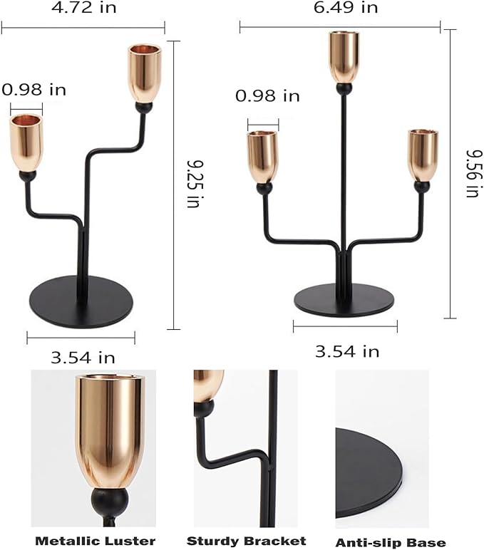 - MODERN ARTISTIC DESIGN THAT CAPTIVATES - This double taper candle holder features a sleek, modern design with its black metal frame and shiny gold - toned taper candle cups. It's like a piece of art for your home. Whether your style is minimalist, contemporary, or even a mix of bold and chic, this decorative double taper candle holder will be the star of your living room, dining table, or mantel. It adds an instant touch of sophistication that draws eyes.
