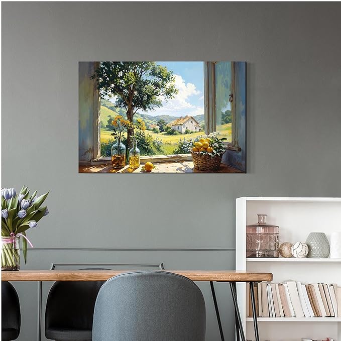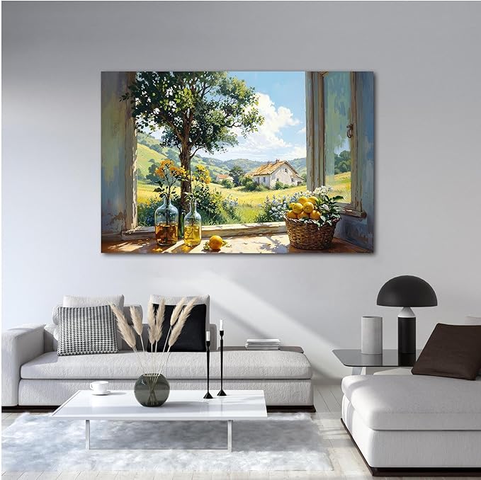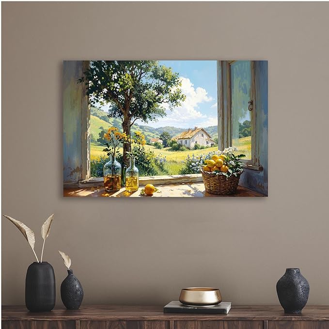 Vintage window farmhouse canvas painting wicker basket full of lemons rolling green hills lush foliage yellow flowers glass bottle rustic charm tranquil country living textured artwork wall decor