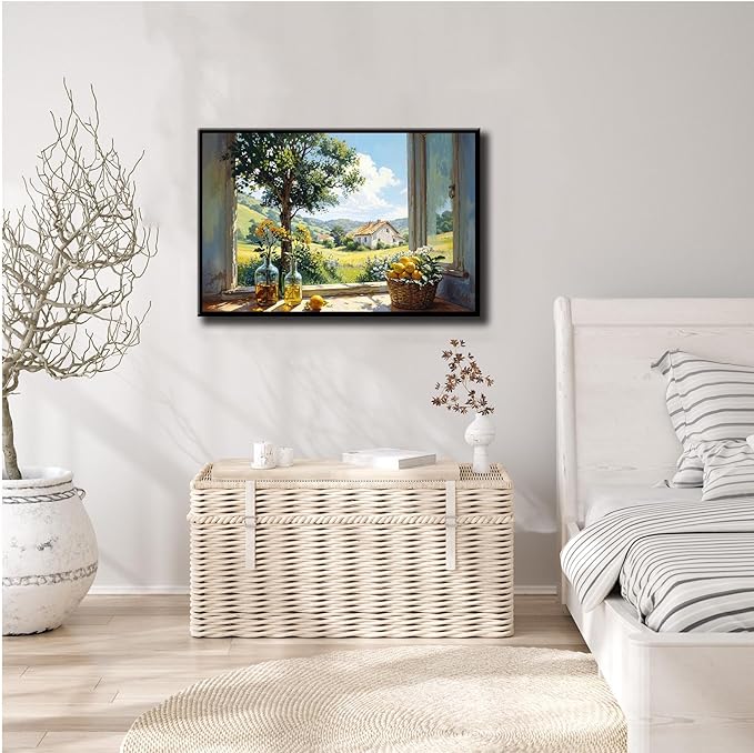 Vintage window farmhouse canvas painting wicker basket full of lemons rolling green hills lush foliage yellow flowers glass bottle rustic charm tranquil country living textured artwork wall decor