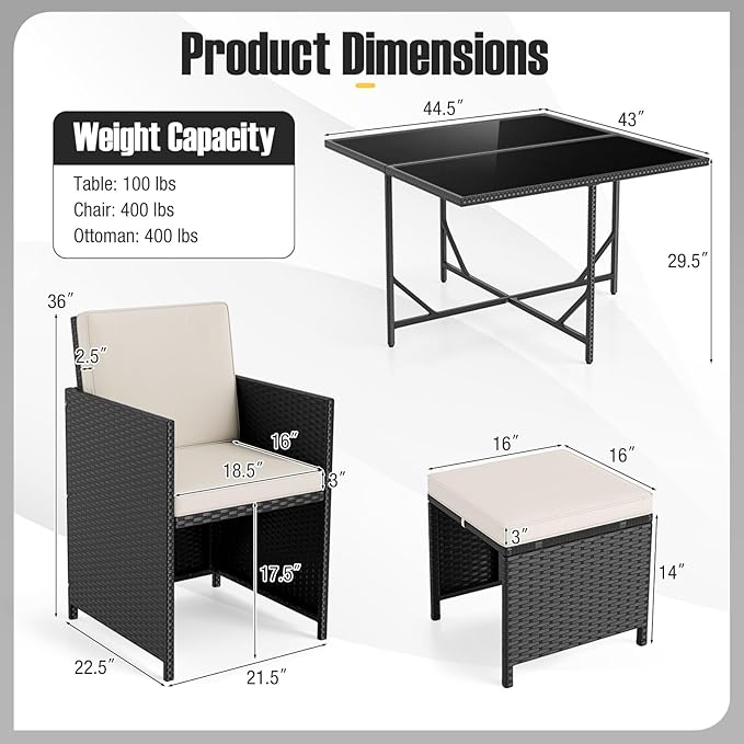 Tangkula 9 Piece Patio Dining Set, Rattan Chairs with Tempered Glass Table & Ottoman, Space Saving Wicker Sectional Conversation Set with Removable Cushions, Outdoor Furniture for Backyard Garden Deck
