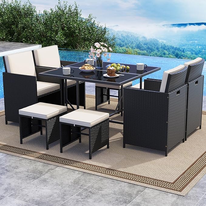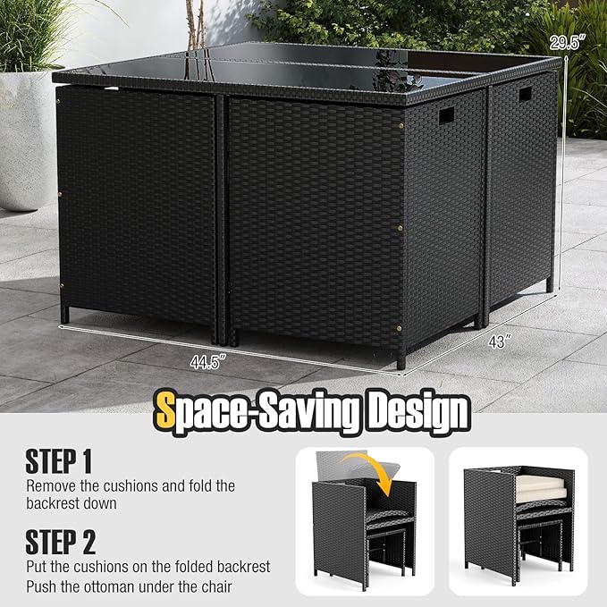 - Space-Saving Storage: Keep your outdoor space tidy and organized with the smart design of the outdoor rattan dining set. The chair backrests can be folded down, and the ottomans can be stored neatly underneath the chairs, saving valuable patio or deck space when not in use. As needed, the chairs can be stored under the table.