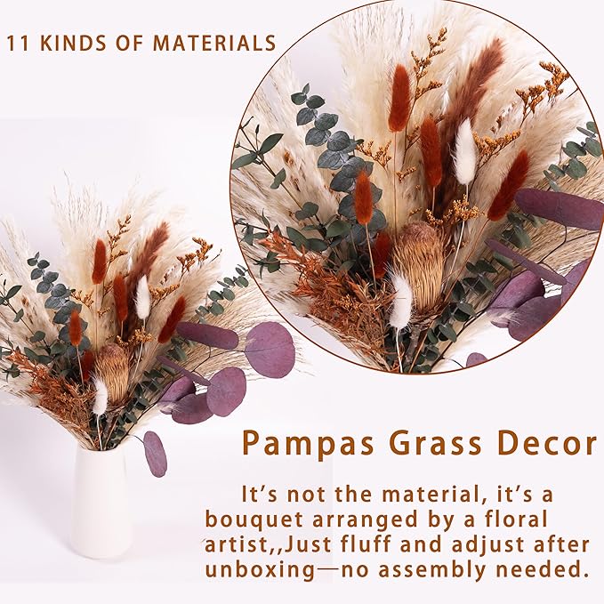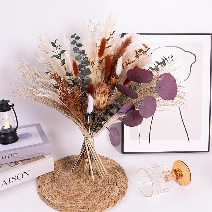 - TIMELESS BOHO ELEGANCE: Featuring pampas grass, eucalyptus leaves,and other premium dried elements, this bouquet offers a naturally elegant look that lasts for months—no watering or maintenance required.