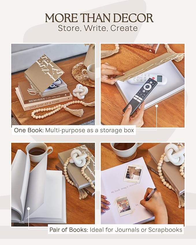 - A STORY TO LIVE BY, FIND INSPIRATION IN EVERY DETAIL: Go beyond simple book decor with a set that inspires. Our decor books feature the powerful phrases "ONE DAY AT A TIME", "MEMORIES: LIVE, HOPE, LOVE", and "ESSENTIALS, ENJOY THE LITTLE THINGS". Use the blank pages inside the large and medium books as a personal journal or photo album for your memories, making this a truly meaningful decorative object