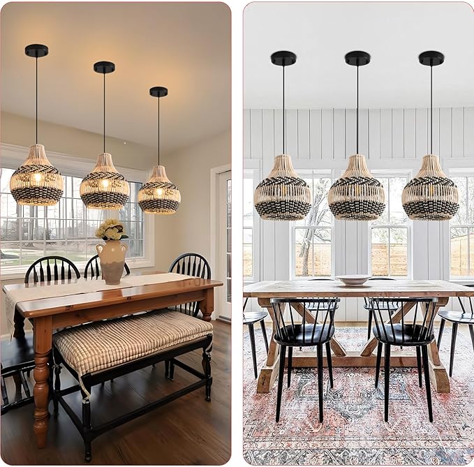 - Wide Adaptations: The 3-Pack rattan pendant light are suitable for scenes such as living room sofa area, bedroom bedside, dining table, kitchen island and farm hut,the black tone is easily integrated into bohemian, retro industrial, simple and natural styles,single hanging or group hanging can create an exclusive style.