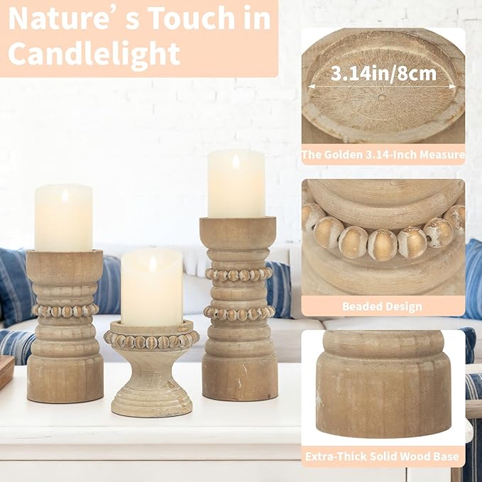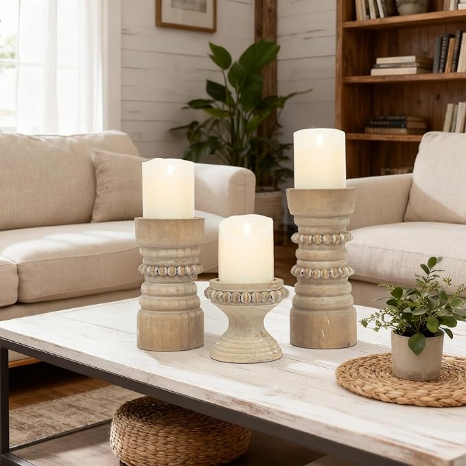 - Multi-Style Compatibility: These wooden pillar candle holders suit modern, farmhouse, rustic, or vintage decor, adding timeless charm to your mantel, dining table, or entryway shelf