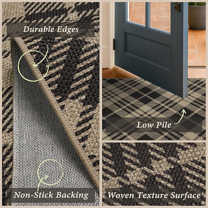 - Black and White Check: A crisp black and white woven check that embodies classic plaid elegance. This versatile rug works beautifully with vintage, maximalist, or victorian décor. Its neutral palette makes it easy to pair with furniture while offering a stylish focal point in high-traffic spaces like french doors indoor entrance and outdoor area