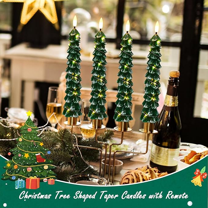 - CHRISTMAS HOLIDAY DECORATIONS: This LED tree flameless candlestick with snowy effect and real wax coating add a happy and romance atmosphere for Christmas home party decoration. It can be placed in your Christmas porch, Windowsill, fireplace, table, office, desk, bedroom, living room, dining room, and other indoor scene. The Christmas tree shaped taper candles with string lights add a perfect touch of festive atmosphere to your home