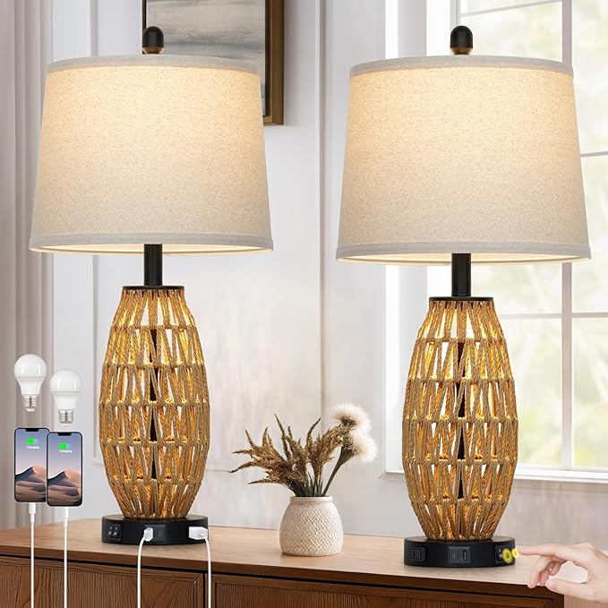 - 【4 LED Bulbs Included】Say goodbye to the hassle of finding compatible bulbs! The wicker table lamp with usb port comes with 4 LED Bulbs with a 25,000 hour lifespan,it will save up to 90% energy. Bedside table lamp with natural linen lampshade softens the light to protect your eyesight. The coastal lamps set of 2 are perfect decorative lamps to any living room, bedroom, entry or office