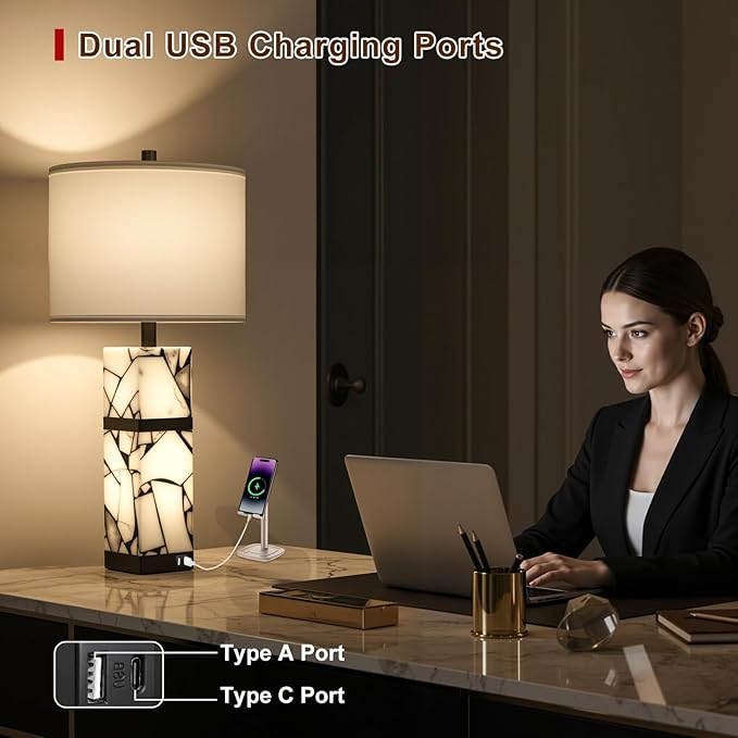 - USB CHARGING PORT ON BASE:This table lamp comes with built-in USB A and USB C ports, a design that not only saves desktop space but also gets rid of the trouble caused by multiple chargers and messy, tangled cables.these dual USB ports support charging for mobile phones and various other electronic devices. What’s more, the charging function remains active whether the lamp is turned on or off.
