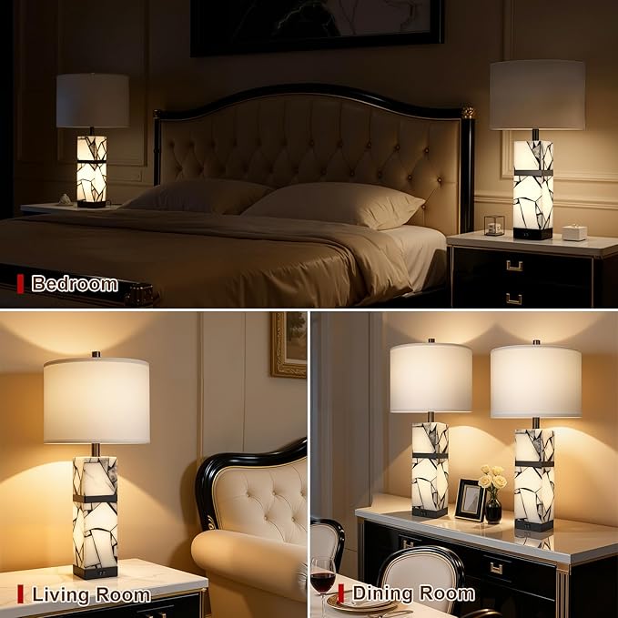 - THEME DESIGN:The lamp has a total height of 27 inch,lamp body is square and made of spanish alabaster,the center of the lamp body has a black metal decorative strip, match 13" x 13" x 10" linen shade,this alabaster table lamp set of 2 are perfect decorations for bedrooms, living rooms, hotels....