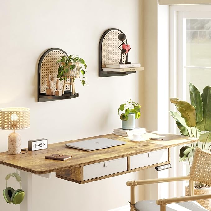 Rattan Shelf Set of 2, 7'' Black Rattan Shelf with Wicker Decor, Boho Wall Decor Small Floating Shelf for Plant Figurines Display, Mini Shelves for Knick Knack Storage