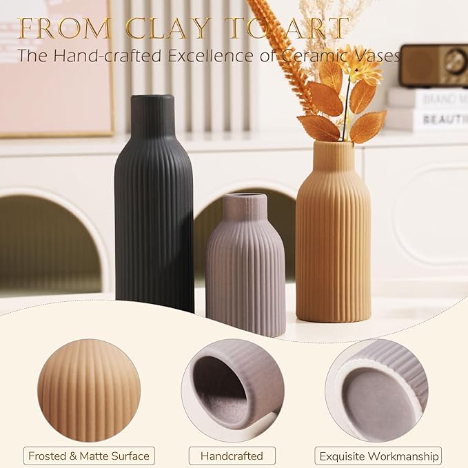 Joeabor Ceramic Vase Set of 3 - Handcrafted Ceramic Vases for Home Decor & Shelf - Modern Farmhouse Decor for Kitchen, Office, Bedroom & Living Room Decorative Objects for Mantel, Table Centerpieces