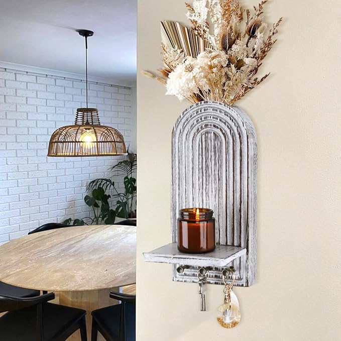 - MULTI-FUNCTIONAL DESIGN - This wooden wall decor is a versatile combination of a wall planter vase, wall candle sconces, and hooks. The top section serves as a planter vase, perfect for holding artificial eucalyptus, dried flowers like pampas grass, or even small live plants. The middle shelf functions as a candle sconce, ideal for placing a jar candle to create a warm and cozy ambiance. And the bottom part comes with hooks, which can be used to hang keys, small bags, or other lightweight items.